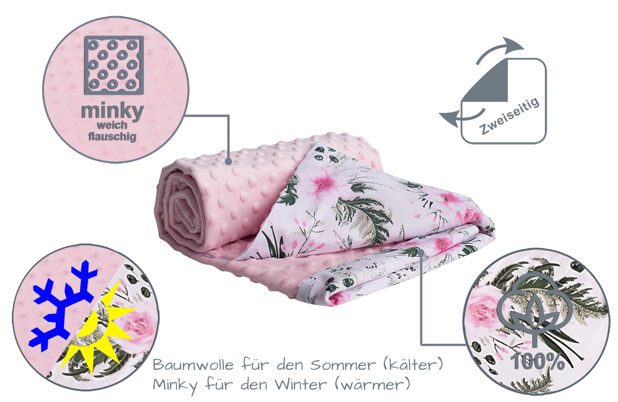 Dwustronny kocyk to doskonałe połączenie najwyższej jakości bawełny z miękkim i przytulnym Minky.Kocyk ma liczne zastosowania - dobrze sprawdzi się w chłodniejsze dni w wózku na spacerze, w domu w łóżeczku jako kocyk do przykrycia dziecka, w samochodzie w czasie podróży. Idealny jako przytulanka, towarzysz wycieczek. W chłodniejsze dni delikatnie ogrzewa, a w cieplejsze pozwala skórze oddychać, zapobiegając przegrzaniu.