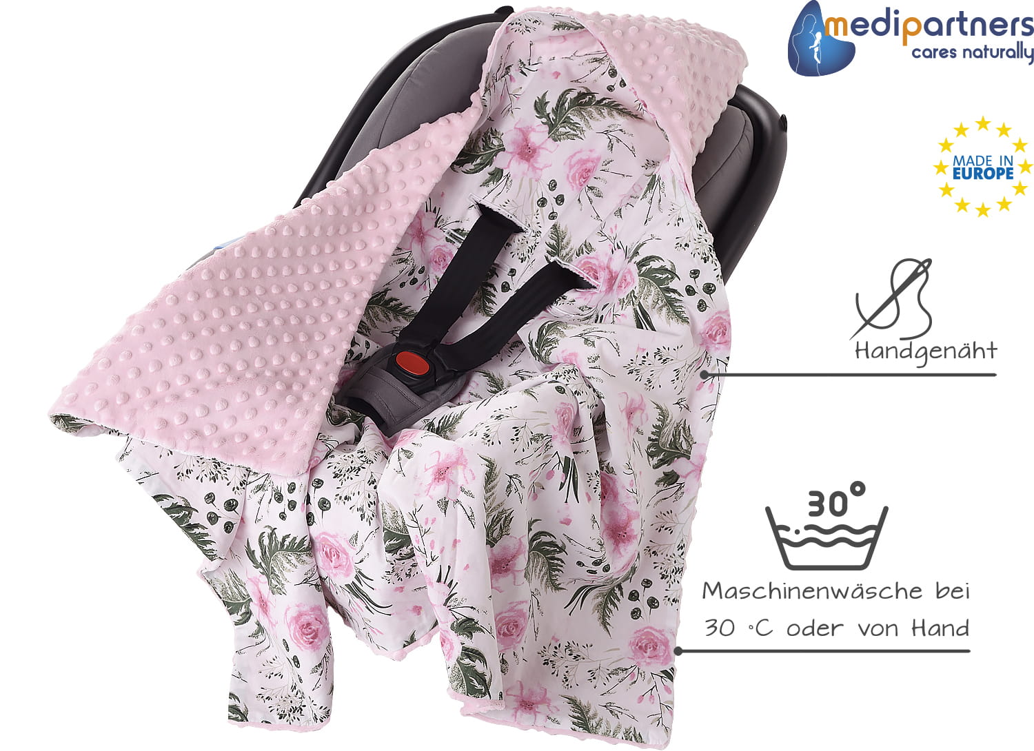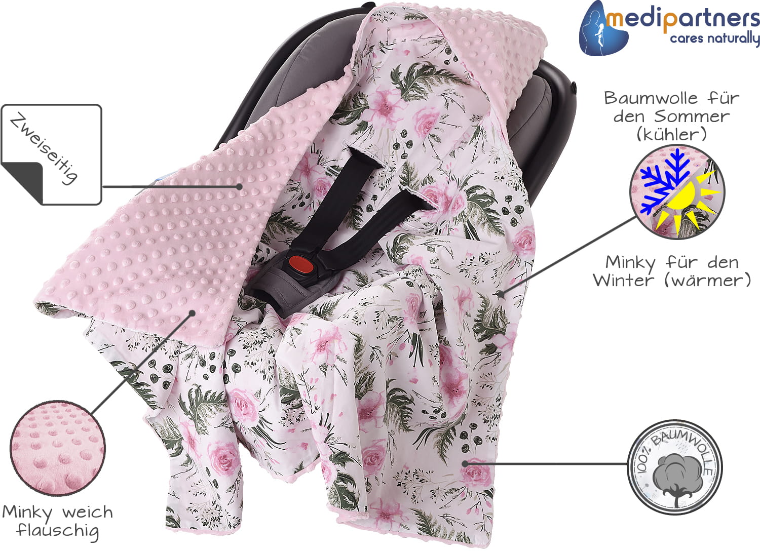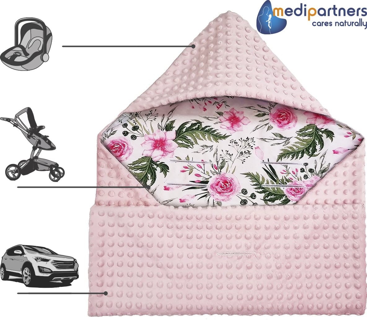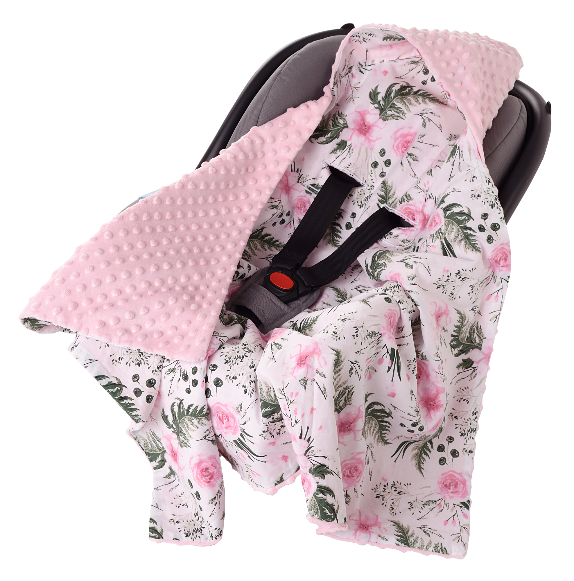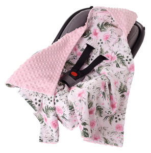Otulacz do nosidełka z kapturkiem 85x85cm - Kwiaty z jasno różowym Minky