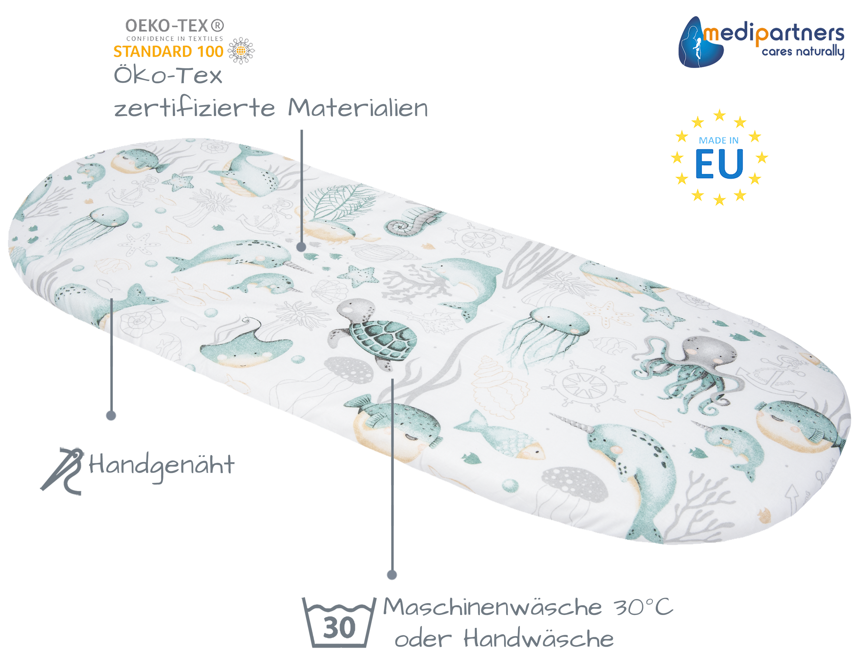 Prześcieradła szyte są z grubej bawełny, która zapewnia doskonałą trwałość na lata. Zaszycia na rogach zapobiegają przesuwaniu. Doskonale sprawdzają się w wózeczka i kołyskach!