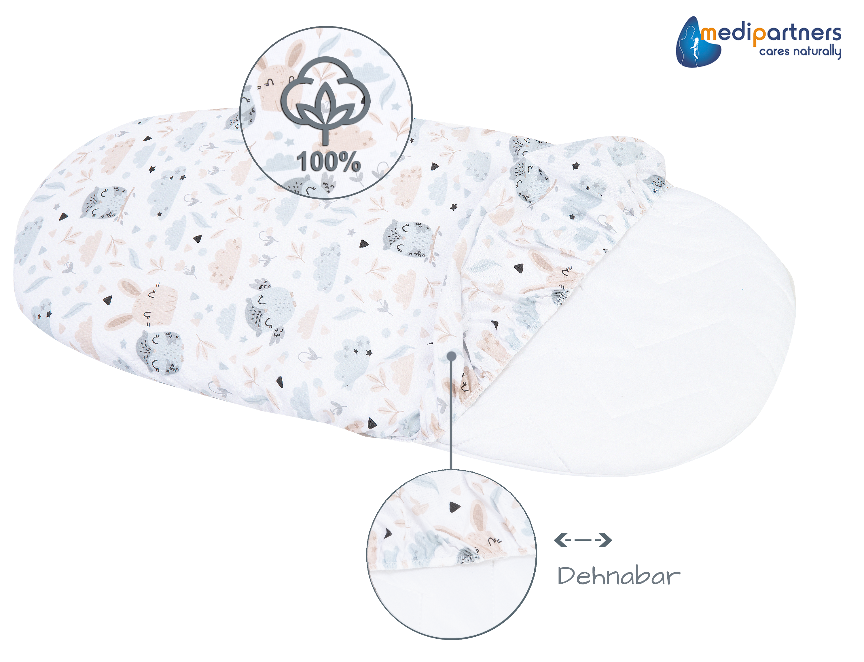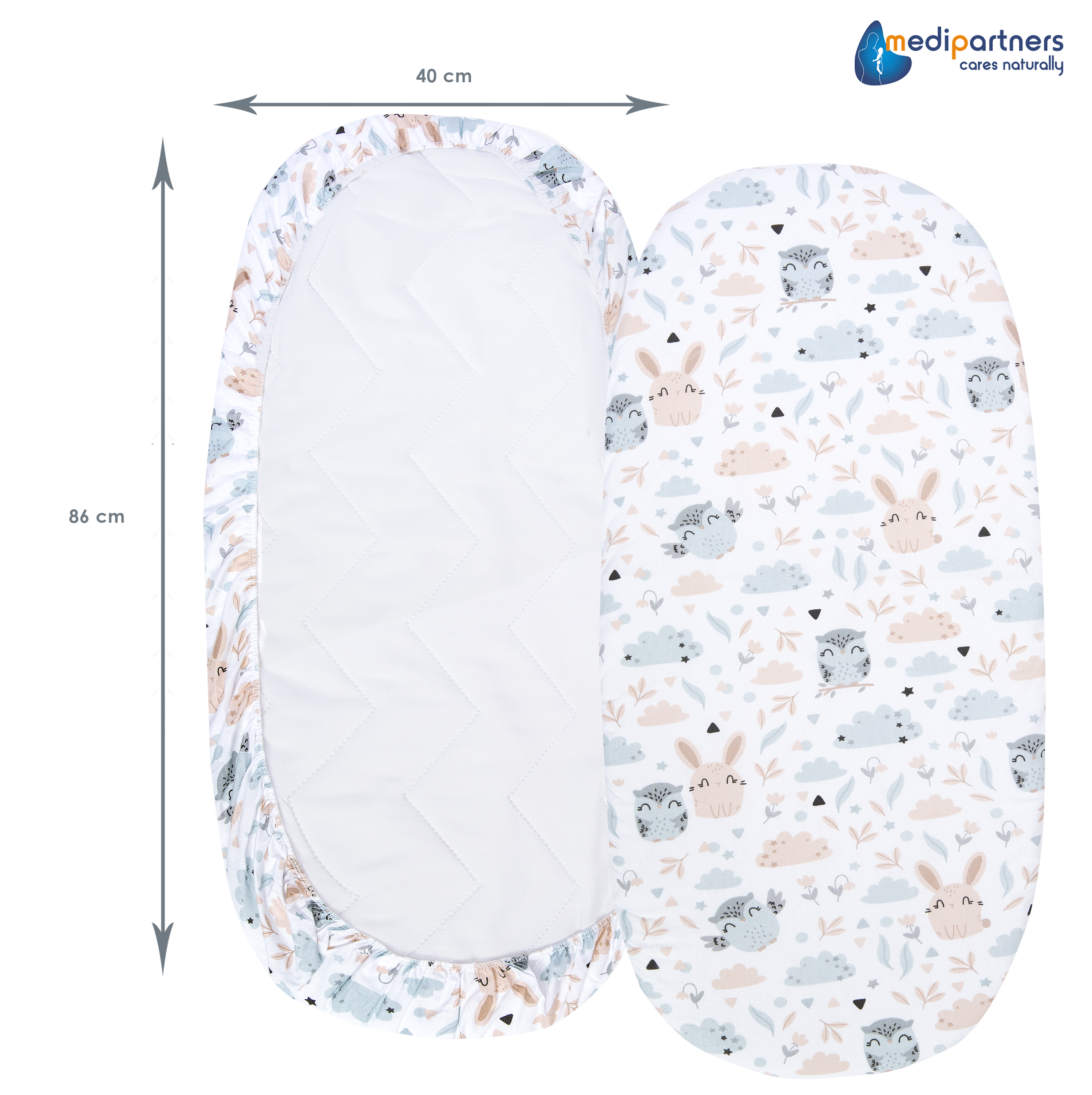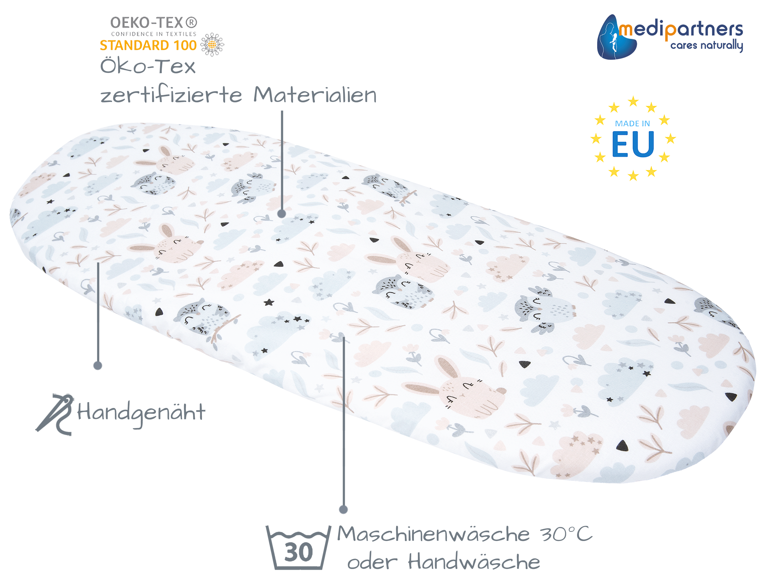 Prześcieradła szyte są z grubej bawełny, która zapewnia doskonałą trwałość na lata. Zaszycia na rogach zapobiegają przesuwaniu. Doskonale sprawdzają się w wózeczka i kołyskach!