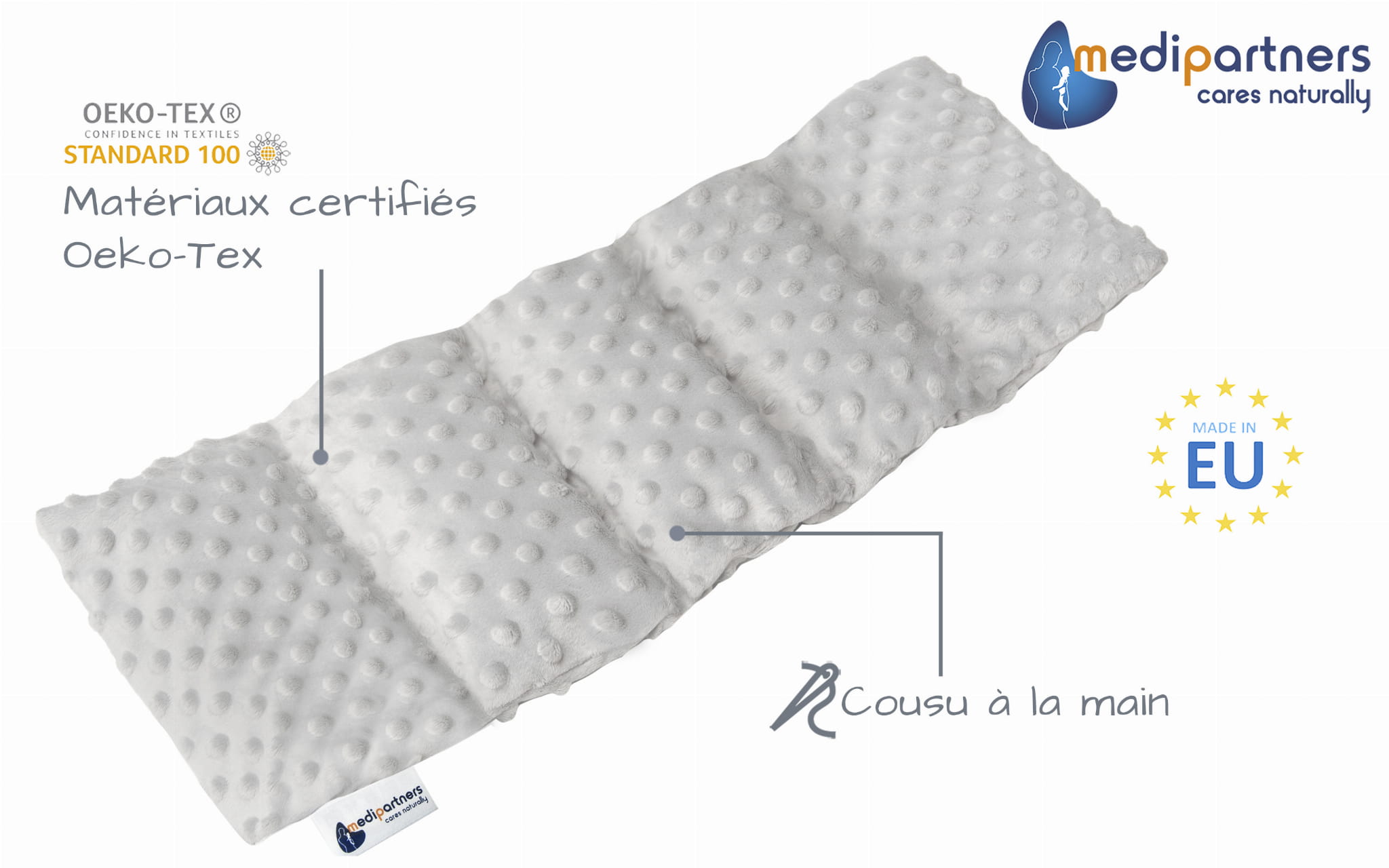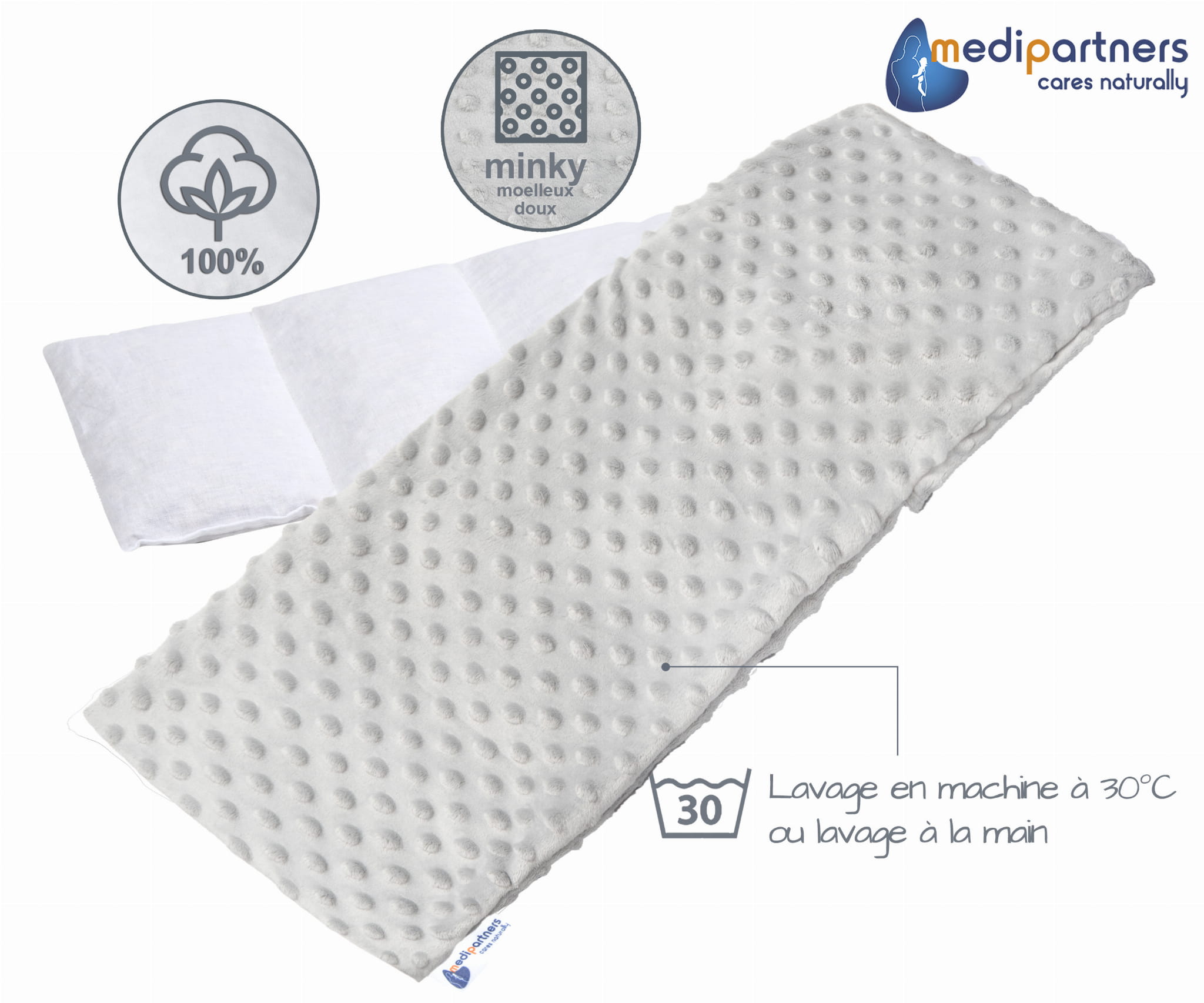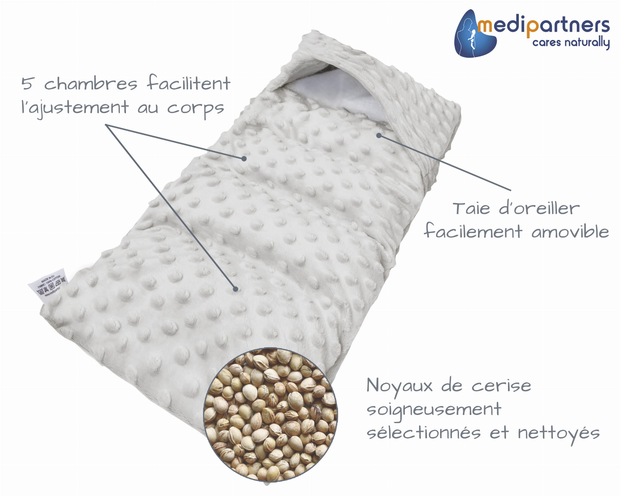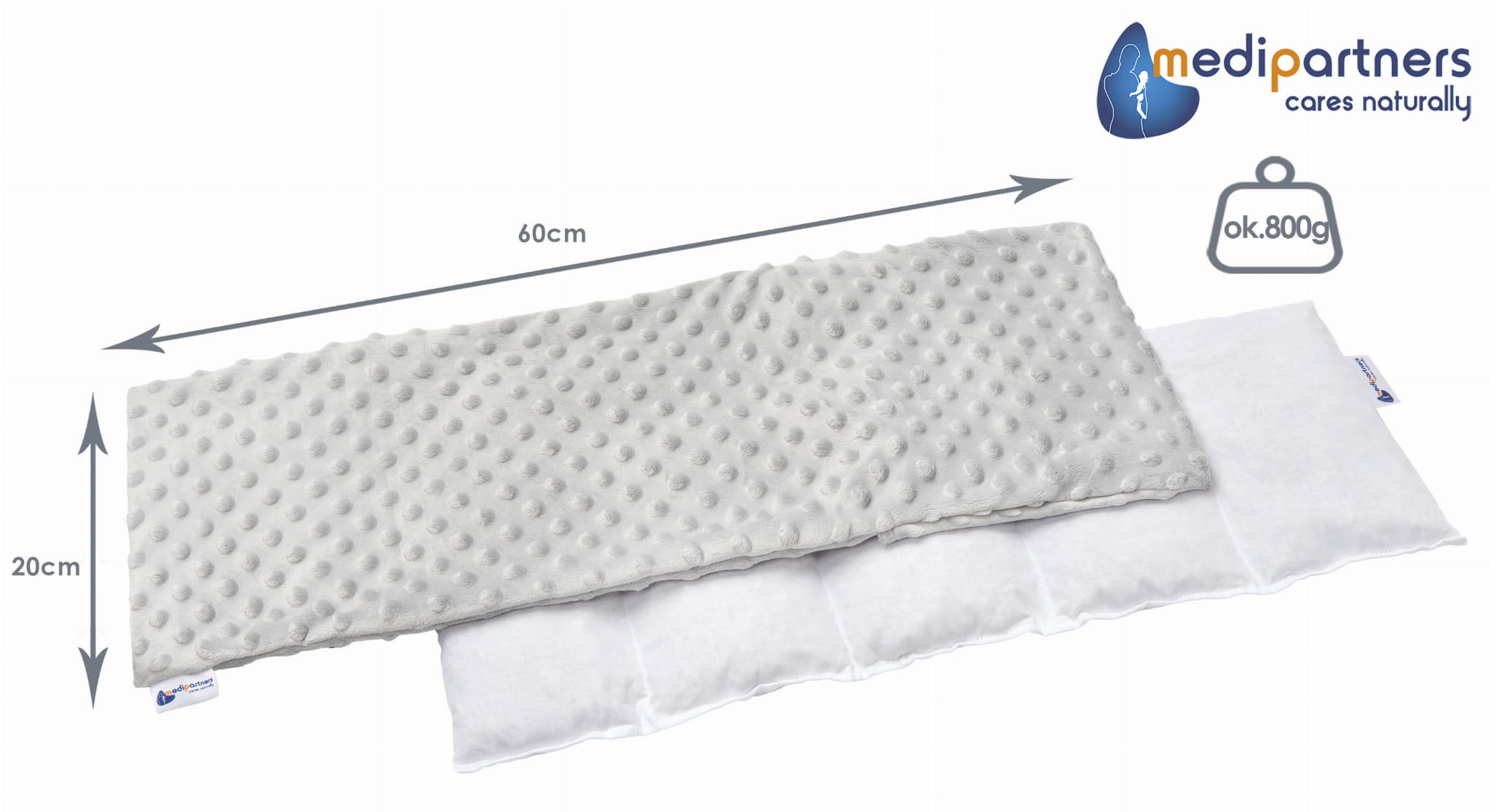 Poduszka z pestkami wiśni ma wymiary 20x60 cm. Materiałem zewnętrznym jest przyjemna w dotyku tkanina Minky. Idealnie nadaje się do leczenia wszelkiego rodzaju bólów mięśniowych. Wypełnienie nie ześlizguje się dzięki 5 komorom.